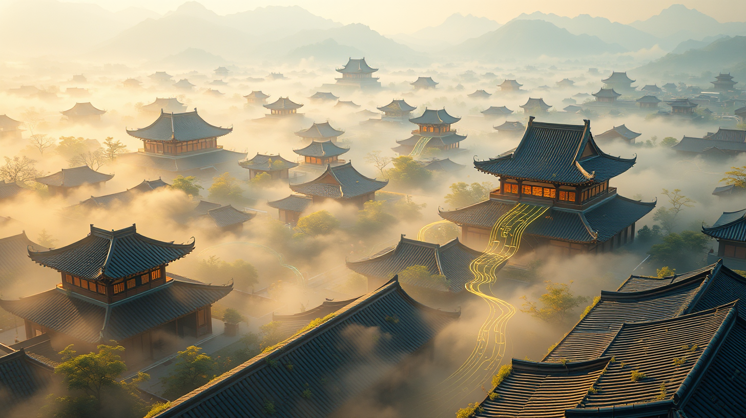 描述:当晨光为古城披上金纱时,纳米技术修复的园林建筑群笼罩在金色薄雾中。量子苔藓在黛瓦表面如活物般流淌,逐渐拼凑出动态的《姑苏繁华图》,古老的飞檐翘角与现代光纹交织,仿佛历史在科技中重生。每一片瓦都化作数字画布,每一道光都成为记忆的笔触,在晨光中谱写出传统与未来的和谐乐章。