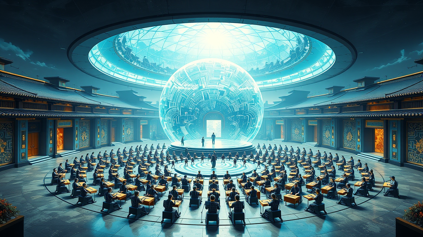 作图提示词:A futuristic circular plaza under a nano-repaired crystal dome, 250 guqin robots arranged in concentric circles playing instruments with dark matter strings, visible sound waves creating ripples in the air, surrounding building facades with dynamic reliefs transforming between classical Chinese painting motifs and geometric patterns, ethereal blue and gold lighting, highly detailed cyberpunk aesthetic with traditional Chinese elements, awe-inspiring technological marvel. The scene is set in a futuristic Suzhou, blending advanced nanotechnology with traditional Chinese culture.