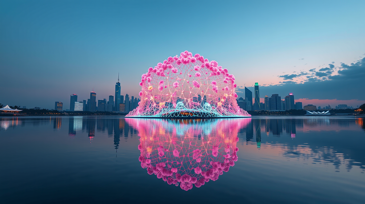 作图提示词:A stunning low-angle shot of Jinji Lake at twilight, reflecting the futuristic city skyline. A massive three-dimensional light web, woven from advanced bio-fibers, rises from the lake’s center. Multicolored energy streams flow through the grid, dynamically morphing between cloud patterns and peony motifs, visually representing the transformation of the digital economy into luminous brocade. Ultra HD reflection effects enhance the vibrant neon colors against the twilight sky, while intricate details of the bio-fiber structure are highlighted. The cinematic composition achieves perfect symmetry between the reality and its reflection, creating a surreal and captivating scene.