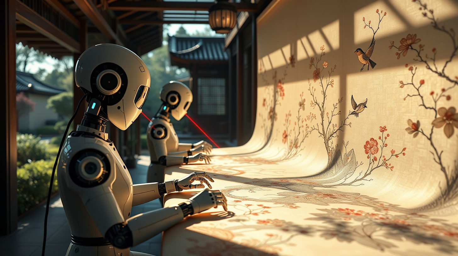 作图提示词:An extreme close-up of robotic embroidery artists working in a Suzhou garden corridor. Their bionic fingers emit precise bio-lasers, stitching intricate designs on levitating programmable silk. The patterns dynamically transform with light—displaying birds and flowers in sunlight, shifting to landscapes in shadow, a modern interpretation of Suzhou embroidery’s ‘three variations in one surface’ technique. Ultra-sharp focus captures the laser stitching points, while intricate details of the robotic hands and silk texture are highlighted. Dynamic lighting showcases the seamless transitions between patterns, embodying the fusion of high-tech innovation and traditional craftsmanship.