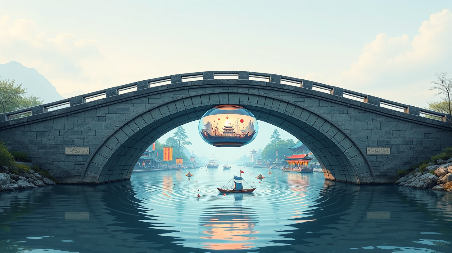 作图提示词:A horizontal shot of an ancient stone arch bridge, featuring a semi-transparent resonance field device suspended beneath it. The device transforms traditional Pingtan music into three-dimensional water ripple projections. As virtual droplets touch the water surface, they trigger holographic scenes depicting the canal’s rich history—Song Dynasty grain ships, Ming merchant fleets, and Qing lantern festivals emerge in sequence. Ultra-detailed water surface textures contrast with the ethereal holographic projections, while the aged stone bridge and futuristic technology create a striking juxtaposition. Soft ambient light complements the vibrant projection colors, enhancing the scene’s magical realism.