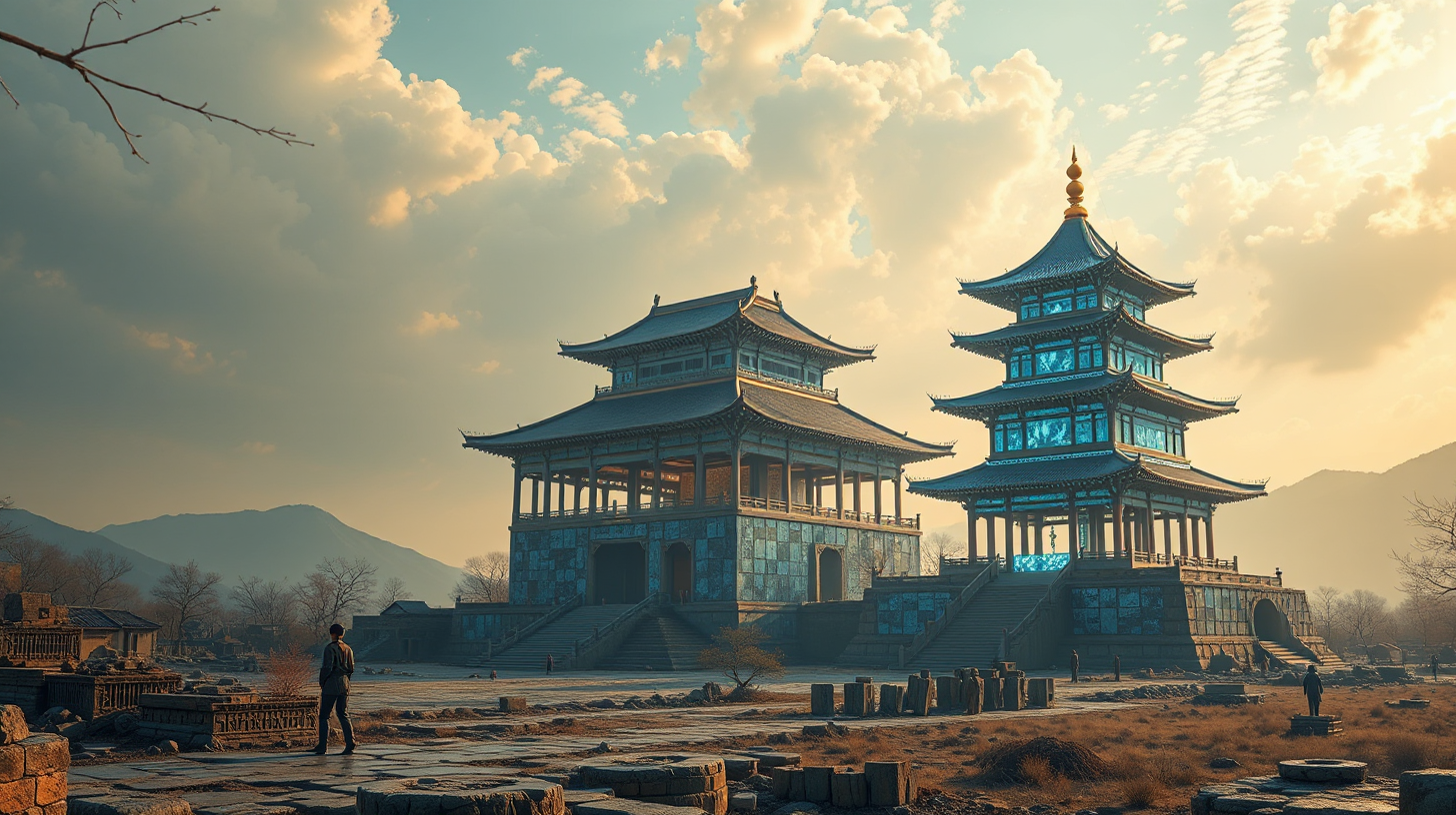 作图提示词:At the Longxing Temple ruins in Shijiazhuang, nanorobots meticulously scan and compile newly discovered Song dynasty tile patterns into three-dimensional light codes. The data streams flow into a hovering ‘Cultural Annual Rings’ installation, blending ancient pagoda holograms with modern smart-glass architecture. A detailed close-up captures the nanobots at work, then pulls back to reveal the entire site—where history meets the future. Soft golden lighting highlights the artifacts, while cool blue tones emphasize the technology. The composition balances intricate details with a grand vista, using chiaroscuro to contrast old and new.