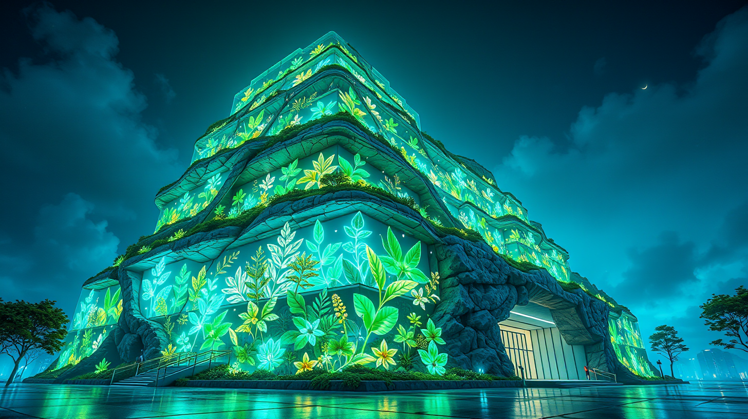 作图提示词:A futuristic server cluster in eastern Shijiazhuang, designed with layered architecture resembling Taihang Mountain’s rock formations, featuring dynamic heat dissipation vents that pulse rhythmically. The surface is illuminated by holographic projections of glowing medicinal herbs, each representing AI-optimized traditional Chinese medicine formulas. The scene is bathed in a bioluminescent blue-green neon glow, creating a fusion of natural aesthetics and advanced technology. Shot from a low-angle perspective to emphasize the structure’s monumental scale, with macro-level details of the glowing herb projections in sharp focus against softly blurred background elements, using a wide aperture for shallow depth of field. The composition employs rule-of-thirds placement with the towering structure offset to create dynamic negative space filled with the ethereal glow.