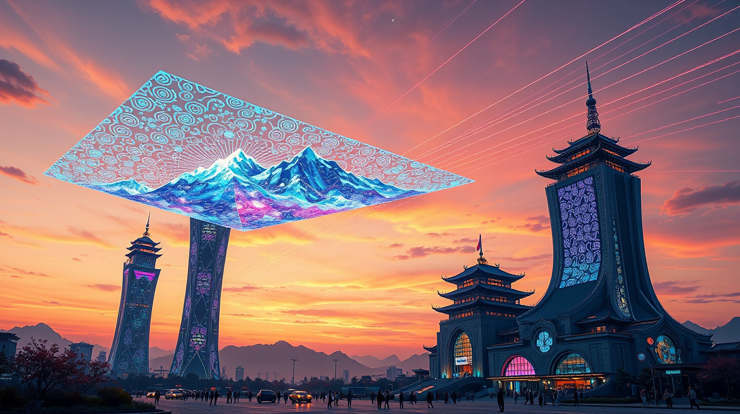 作图提示词:A futuristic dawn scene in Shijiazhuang, Hebei, China, where quantum textile towers illuminate the sky with holographic projections of traditional Yan-Zhao patterns. Robotic arms weave a dynamic ‘Taihang Mountain Dawn’ tapestry mid-air, its colors shifting with the brainwave emotions of citizens below. Towering architecture glows with intricate light patterns, while nanofibers crisscross the sky like luminous threads. The warm sunrise palette blends oranges and purples, casting a cinematic glow. Shot with a wide-angle lens from ground level to emphasize the scale and technological marvel, using dynamic lighting to highlight the fusion of tradition and innovation.