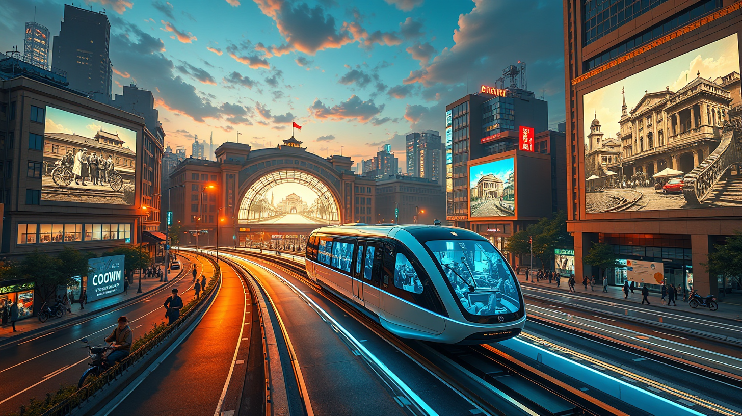 作图提示词:During evening rush hour in Shijiazhuang, maglev lanes seamlessly reconfigure into a circular theater. Building facades project holographic memories of the old railway station, while commuters’ mobile uploads generate real-time narrative branches. The shot follows a maglev vehicle transitioning into the theater space, capturing the interplay of historical projections and modern transit. Neon-lit and dynamic, the urban nightscape features floating holograms of historical scenes, maglev lanes glowing with trajectory lines, and buildings serving as projection screens. Warm nostalgic tones blend with cool futuristic hues, using high-contrast lighting to emphasize the fusion of eras.