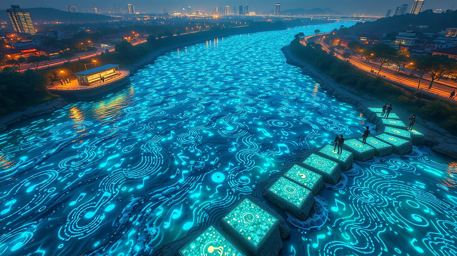 描述:改造后的滹沱河床闪烁着蓝宝石般的光泽,生物光伏细胞随水波起伏,将光能转化为清洁能源。河岸的生态钢琴被电流激活,每一次能量脉动都化作空灵音符,吸引市民踩着发光跳石过河。脚步落下时,水面激起透明的光之涟漪,音符如银鱼般跃动,让古老的河流成为科技与自然共谱的交响乐章,在晨光中流淌出奇幻韵律。
