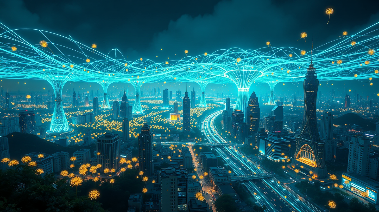 作图提示词:A panoramic nightscape of futuristic Shijiazhuang at midnight, where quantum textile towers emit luminous optical fibers that interweave into a vast neural network canopy over the metropolis. Countless floating conceptual models glow like biotechnological dandelions, each representing citizens’ creative ideas. The scene is illuminated by an ambient cyan glow from the neural network contrasted with golden highlights from the floating models. Captured from an elevated perspective at 200mm focal length to compress the cityscape, using long exposure to create light trails from moving elements. The color palette balances cool network lighting with warm model accents, while the composition uses leading lines from the fiber network to guide the viewer’s eye through the frame. Atmospheric perspective enhances depth with subtle haze effects on distant structures.