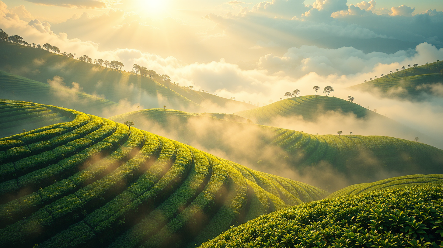 作图提示词:A breathtaking aerial view of tea mountains at dawn, with neatly arranged organic-technology hybrid tea bushes shrouded in mist. Sunlight filters through the clouds, casting golden rays that activate bioluminescent patterns in the leaves. The scene exudes tranquility with soft morning glow, featuring vibrant green terraces contrasted with subtle energy signatures, captured in ultra-detailed landscape photography with shallow depth of field to emphasize foreground details.
