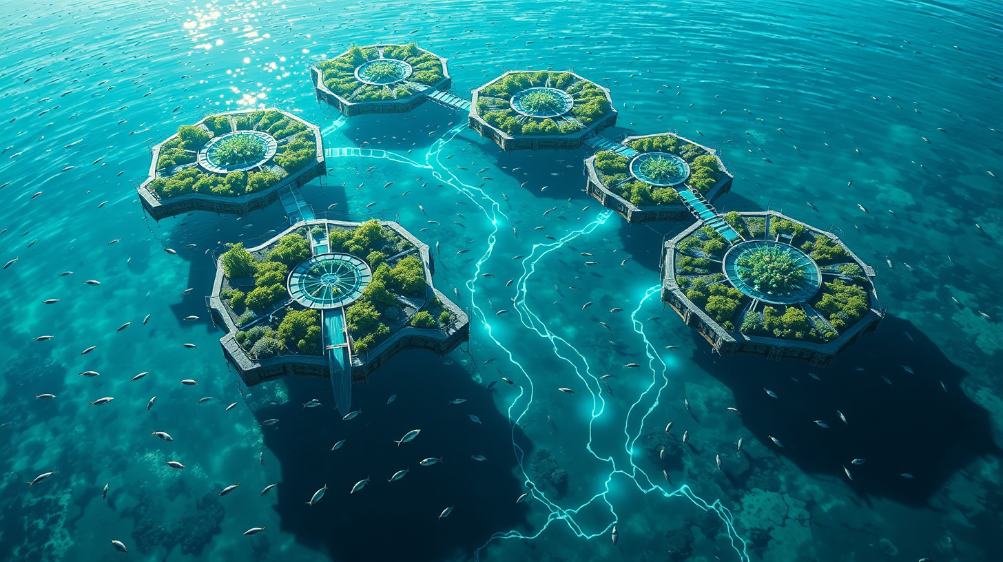 作图提示词:An aerial view of an advanced marine aquaculture system featuring floating eco-platforms arranged in harmonious patterns. Symbiotic clean-tech systems create dynamic nutrient flows visible as subtle bioluminescent traces in the water. Schools of fish move through the structures, their paths enhancing the ecosystem balance. Captured in ultra-detailed oceanic photography with vibrant blue-green tones, using polarized lighting to reveal the water’s crystalline clarity and depth.