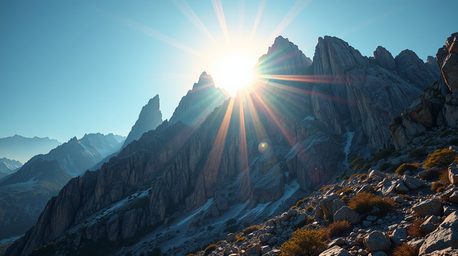 作图提示词:A majestic low-angle shot of Taimu Mountain’s granite peaks at sunrise, where intelligent light-responsive surfaces create localized prismatic effects. Sunlight interacts with crystalline deposits in the rock, producing ethereal color spectrums that dance across the formations. The composition balances the mountain’s natural grandeur with subtle technological enhancements, captured in ultra-detailed landscape photography with dramatic backlighting and rich texture contrast.