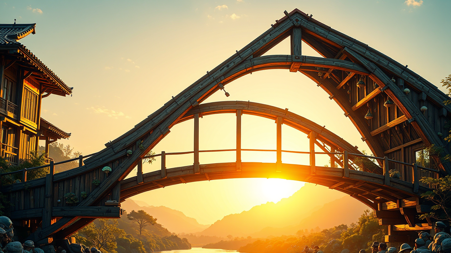 作图提示词:A side view of a centuries-old wooden arch bridge where traditional craftsmanship merges with subtle quantum technology. The timber structure incorporates bio-luminescent fungi patterns that pulse gently, while nano-scale preservation processes maintain historical integrity. Warm golden-hour lighting highlights the bridge’s geometry, captured in detailed architectural photography with balanced composition and rich textural contrast between organic wood and delicate light emissions.