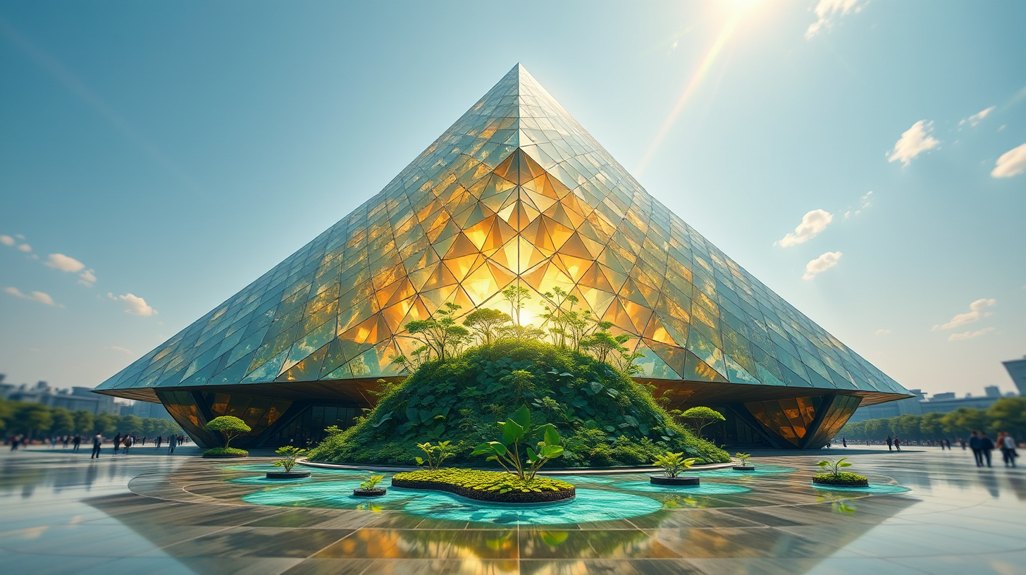 作图提示词:A cathedral-scale ecological prism in Ningde’s central plaza, its faceted quartz surfaces modeled after tea leaves, projecting real-time terrabyte visualizations of regional ecosystems. Floating phytopia models emit restorative pulses. Shot with a wide-angle tilt-shift lens to emphasize both the structure’s 300-meter height and miniature floating biomes. Morning backlighting creates rainbow caustics across photovoltaic surfaces, while the color palette contrasts warm amber tea tones with cool aquamarine data streams.