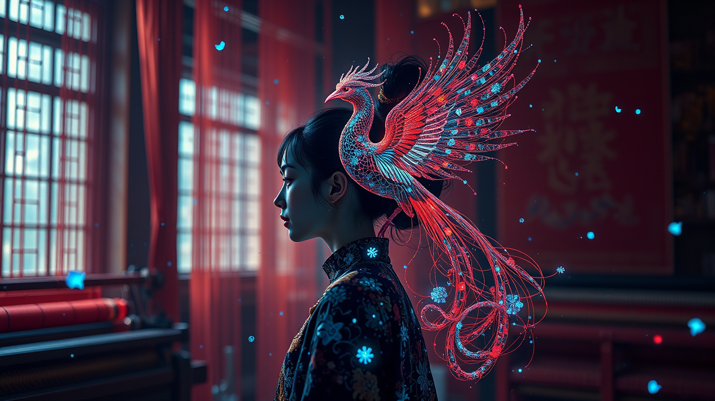 作图提示词:A neural-textile atelier where ancient She embroidery phoenix motifs materialize as photonic threads, woven by AI looms that translate artisans’ brainwaves into chromatic nano-fibers. Each garment emits subtle holograms of its creation process. Cinematic volumetric lighting illuminates floating thread particles, with a shallow depth of field focusing on intricate needlework patterns transitioning into digital fractals. Color grading balances vermilion/indigo heritage tones with bioluminescent cyan accents, showcasing the hovering textile constructs.