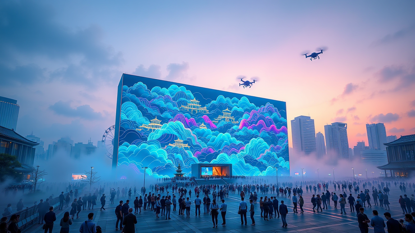 作图提示词:A grand futuristic plaza in 22nd century Suzhou, where quantum-emotional walls dynamically transform crowd’s brainwaves into 3D Suzhou cloud motifs. The 80-meter nanotech wall pulses with bioluminescent hues (cyan/magenta/gold) that interact with self-cleaning photocatalytic facades of surrounding buildings. Shot with a 24mm tilt-shift lens at magic hour, using long exposure to capture the light trails from floating projection drones. Composition follows the rule of thirds with the wall as focal point, while depth is created through atmospheric perspective of light-absorbing aerogel mist.