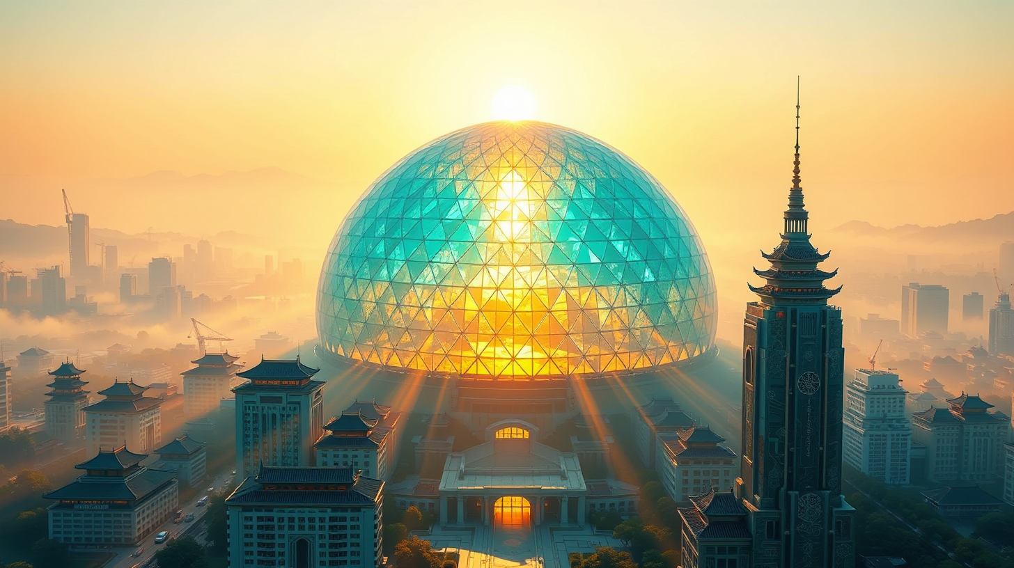 作图提示词:A breathtaking dawn aerial view of futuristic Suzhou, where a massive quantum-reinforced crystal dome refracts prismatic light spectra across nanotech-enhanced building facades that dynamically morph between Suzhou embroidery patterns and futuristic circuitry designs. The morning sun casts golden hour lighting through atmospheric haze, creating volumetric god rays that interact with the dome’s light diffraction. Shot with a high-resolution tilt-shift lens to emphasize both architectural grandeur and intricate surface details, using a complementary color palette of teal quantum glow against warm sunrise tones.