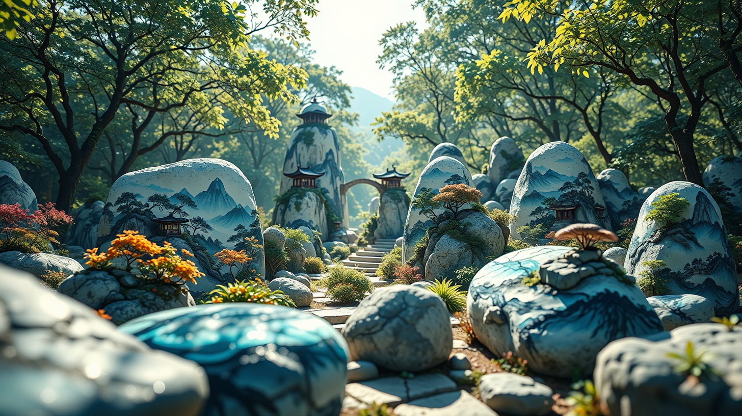 作图提示词:An intimate macro-to-wide shot sequence in the Humble Administrator’s Garden, where programmable matter rock formations respond to visitors’ brainwaves by generating dynamic ink wash animations across their surfaces. The initial tight focus (f/2.8 macro) reveals incredible detail of nanoscale ink particles self-organizing into traditional landscape paintings, then pulls back (24mm at f/8) to show entire rockeries alive with emotionally-responsive artwork. Lighting combines natural dappled sunlight with subtle subsurface scattering from the active nano-pigments, creating a magical interplay of organic and technological aesthetics.