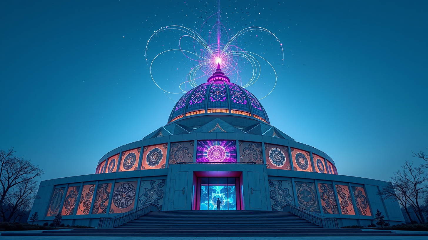 作图提示词:A dramatic low-angle shot of the Silk Museum’s astonishing metamorphosis, where its dome unfolds into a five-pointed stellar observation deck with visible quantum particle collision trails. The building’s facade features nano-relief panels that cycle between Song Dynasty silk patterns and real-time data visualizations from the particle collider. Shot with a wide-angle lens (16mm) to emphasize the architectural scale, using high dynamic range photography to capture both the intense plasma glow from the collider and subtle cultural relief details. The color scheme balances the purple-blue of quantum energy with the earthy tones of traditional pigments.