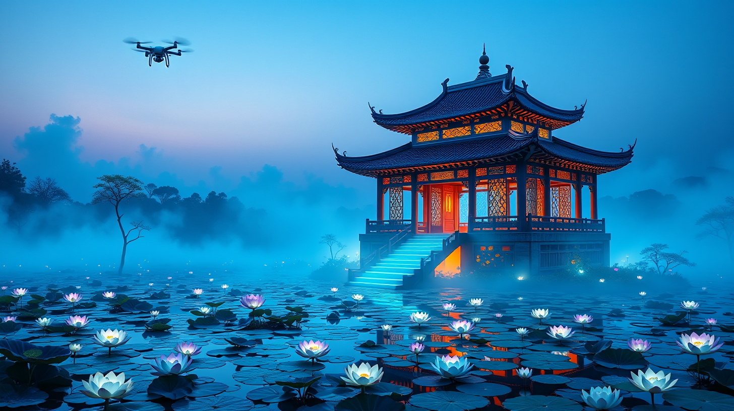 作图提示词:The ancient Canglang Pavilion reimagined with 22nd century bio-metallic tech: its memory alloy framework houses photosynthetic nano-algae that emit circadian-rhythm lighting (soft amber to indigo). The surrounding moat flows with stabilized quantum plasma in lotus patterns, refracting through self-assembling prismatic fog. Captured at blue hour with a 100mm macro lens to highlight the pavilion’s fractal-based corrosion-resistant carvings, while a drone light-paints the scene with adaptive exposure. Color palette balances tungsten-lit architecture against cool bioluminescence, with chiaroscuro lighting emphasizing the fusion of Song Dynasty proportions with metamaterial engineering.