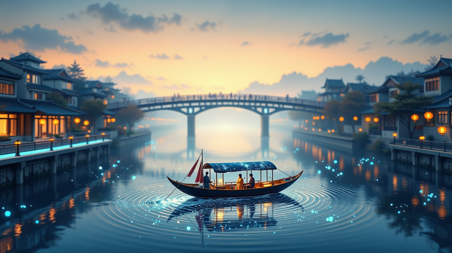 作图提示词:A serene horizontal composition of Suzhou’s transformed canals at twilight, where magnetically-levitating walkways glow with bioluminescent circuitry above photon-powered boats that leave holographic ripples. The water surface becomes a quantum projection screen displaying an animated interpretation of ‘Night Mooring at Maple Bridge’, with traditional ink wash elements dynamically interacting with the boat’s movements. Shot with a medium telephoto lens (85mm) at f/2.8 to create beautiful bokeh of the floating light points, using a cool-warm color contrast between the blue quantum projections and amber traditional lanterns.