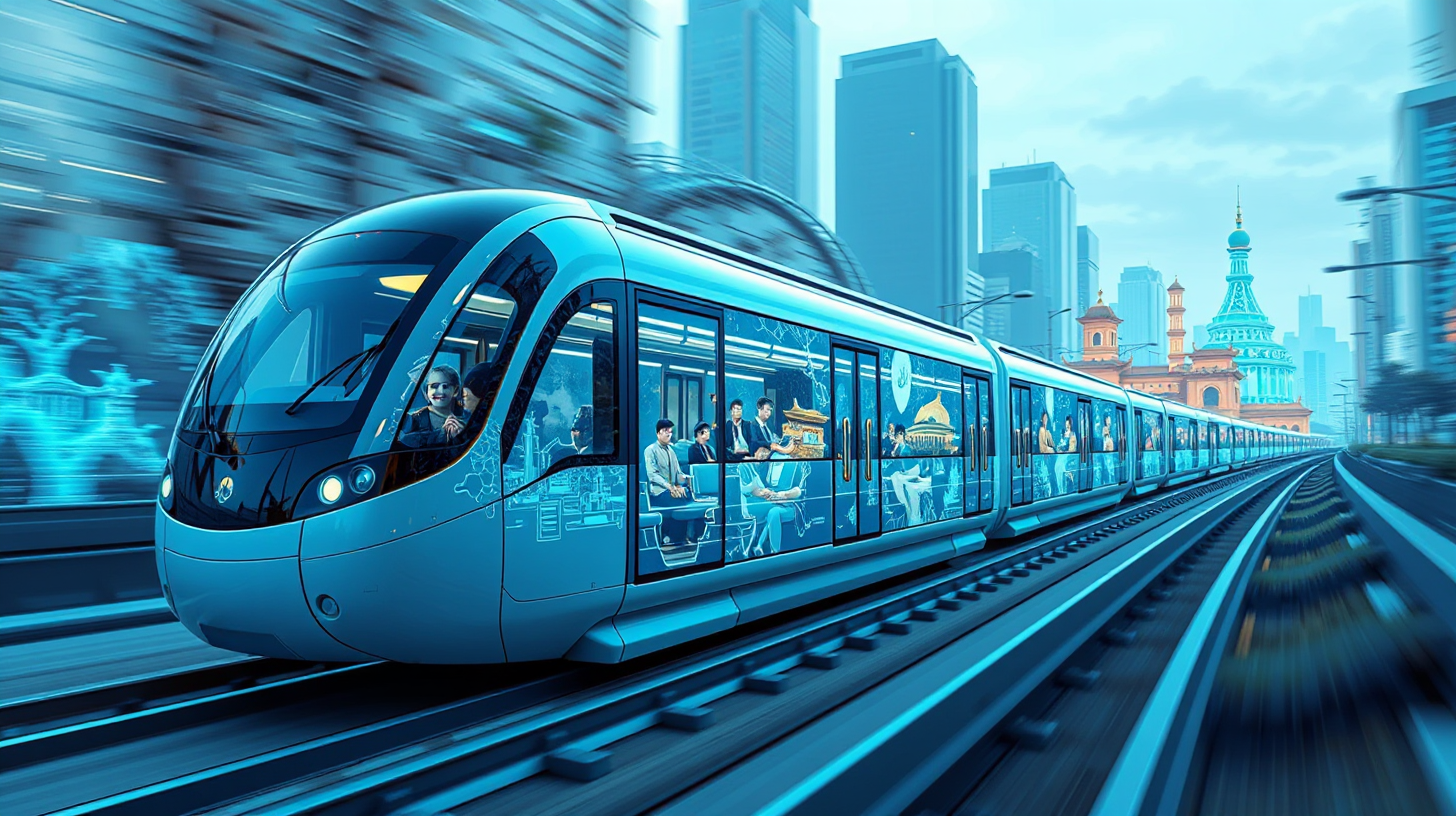 描述:贯穿城市的磁悬浮轨道如粉色珊瑚礁般生长,车厢外壳随乘客的情绪起伏变换透明度——喜悦时化作琉璃般的澄澈,沉思时转为雾蓝的朦胧。当列车掠过八大关的红瓦绿树,轨道瞬间绽放全息剧幕:1930年代的旗袍女子在梧桐树下驻足,德国建筑师的钢笔在图纸上划出弧线。乘客的惊叹声如钥匙,不断解锁着建筑肌理中封存的百年往事。
