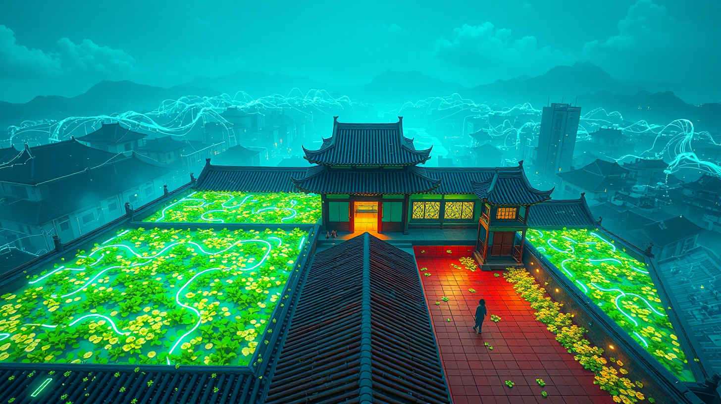作图提示词:A futuristic traditional Chinese courtyard roof transformed into a quantum photosynthesis array, glowing algae growing between red tiles, intricate light patterns flowing across the rooftop during morning exercises, aerial view capturing the fusion of ancient architecture and bioluminescent technology, vibrant cyan and amber light effects, ultra-detailed sci-fi realism with cinematic lighting, reflecting a harmonious blend of tradition and advanced biotechnology in 22nd-century Qingdao.