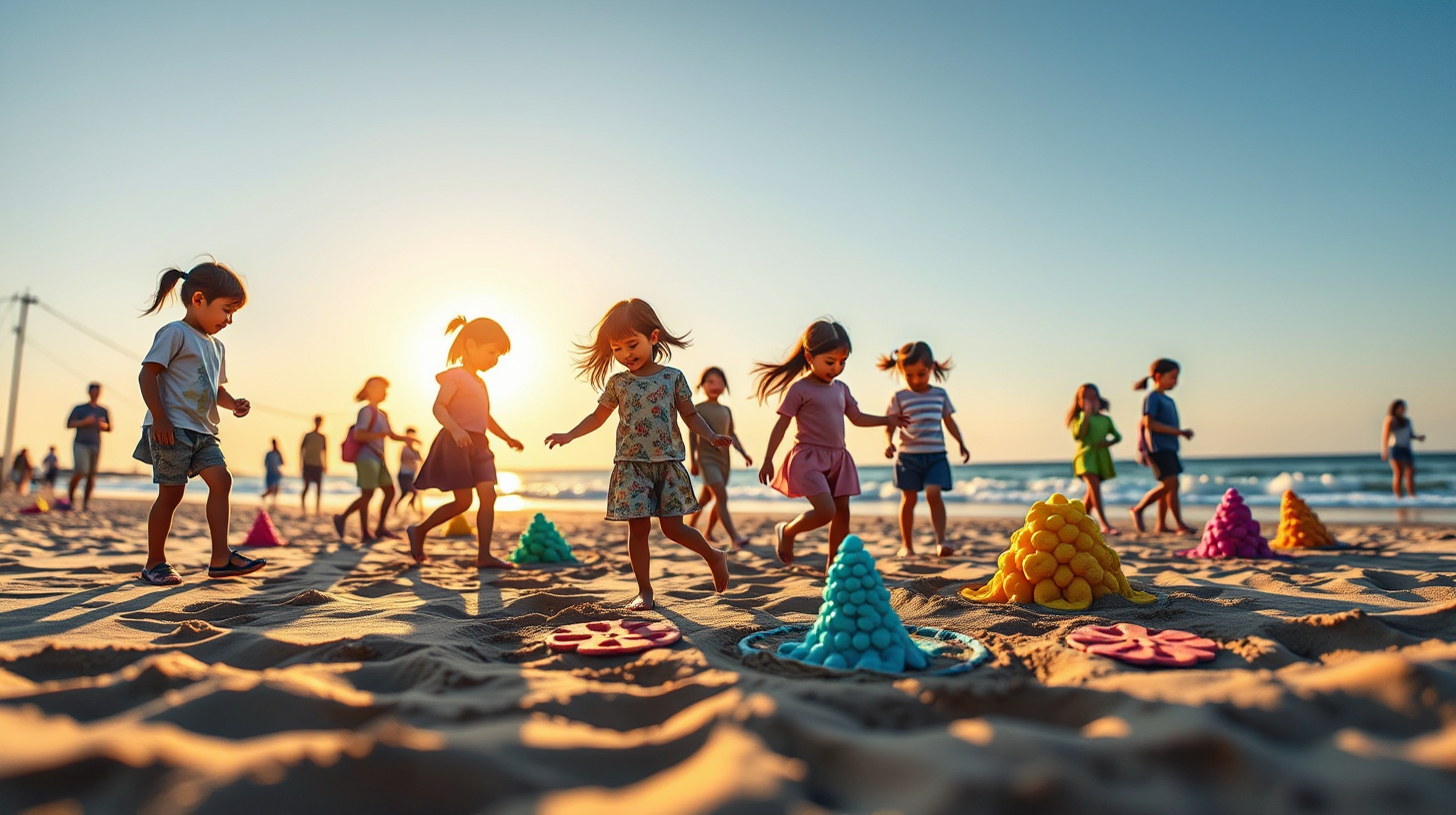 作图提示词:A lively scene along Qingdao’s seaside promenade, where wave-powered sand printers create colorful sculptures. Children joyfully step on the sand to trigger the devices, and as waves wash ashore, the nanotech sand solidifies into intricate designs. The low-angle composition captures the children’s silhouettes against the setting sun, with the colorful sculptures adding vibrant accents to the sandy beach. Shot with a wide-angle lens close to ground level to emphasize the children’s silhouettes and sand sculptures. Using the warm light of golden hour to create dramatic shadows and highlight the vibrant colors of the sand prints. Deep depth of field to keep both foreground sculptures and background sea in focus.
