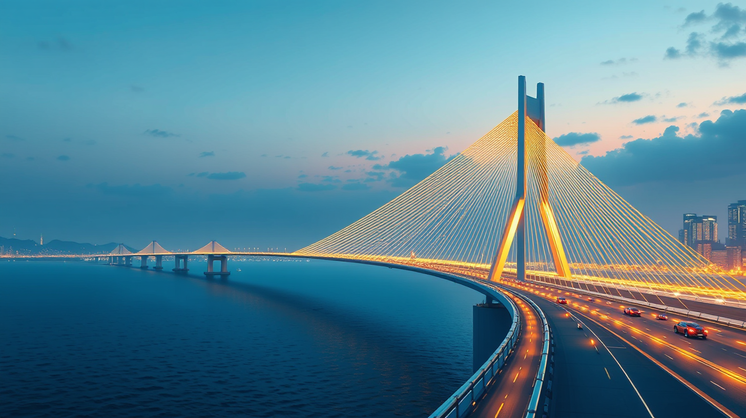 描述:胶州湾大桥的斜拉索化作情感共振弦,每当车辆驶过,钢索便按乘客的心跳频率震颤,发出如竖琴般的和声。周末黄昏,整座桥梁舒展光翼,万千光点在海面上空编织成立体投影幕:婴儿的第一声啼哭、情侣在桥头的初吻、老人望向故乡的目光……这些被收集的希望影像随海浪起伏,让钢铁巨构成为一座会呼吸的城市记忆博物馆。
