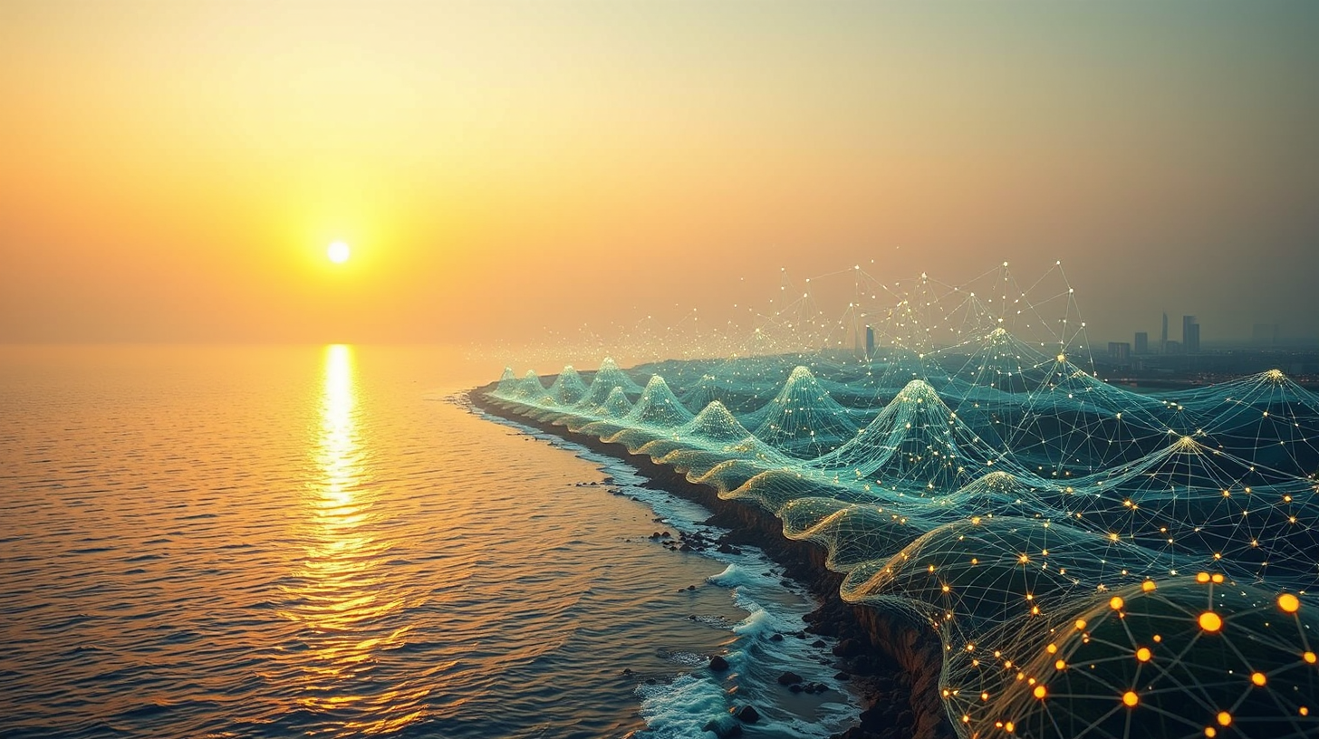 描述:晨曦为青岛近海镀上金纱,纳米纤维编织的智能渔网群如活物般随潮汐起伏,拓扑结构如交响乐指挥棒划出流动弧线。渔网节点渗出星芒般的微光,与海浪撞击的韵律共振,将深蓝海洋的数据谱写成空中漂浮的全息星图。渔民的手势掠过光网,特定鱼群的轨迹便在波光中闪烁,科技与自然在此完成一场无声的协奏。