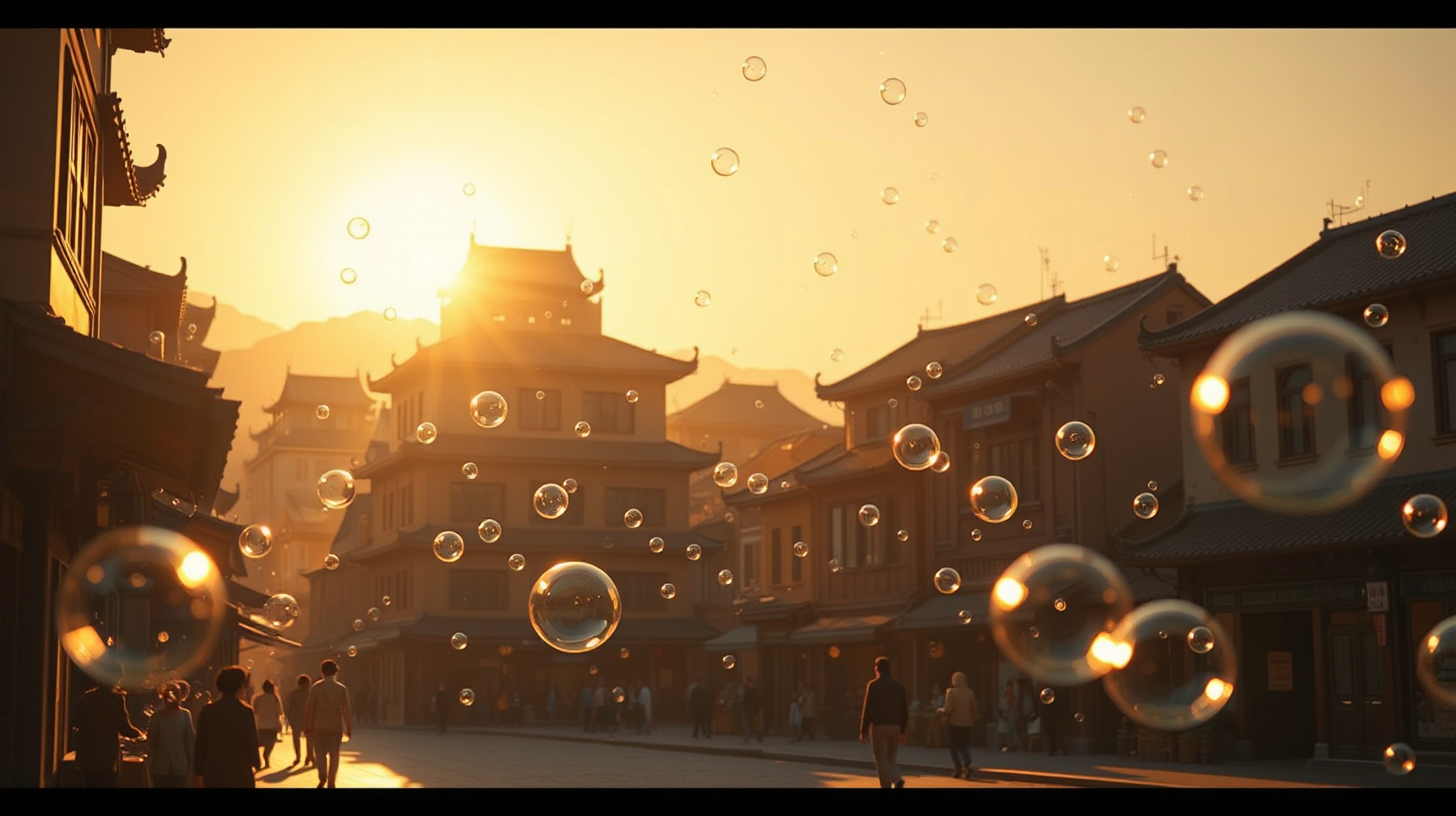 作图提示词:A mesmerizing sunset scene in Qingdao’s old town, where traditional buildings are adorned with straw-like biosensors on their facades. The sensors release beer-scented bubbles that carry fragments of the city’s daily memories. The golden light of the setting sun casts long shadows, while the floating bubbles create a dreamlike atmosphere. The composition highlights the contrast between the historic architecture and the futuristic technology, with the warm tones enhancing the nostalgic feeling. Shot with a medium telephoto lens to compress perspective, using backlighting to silhouette the traditional architecture while illuminating the floating bubbles. Shallow depth of field to make the bubbles stand out against the slightly blurred background.