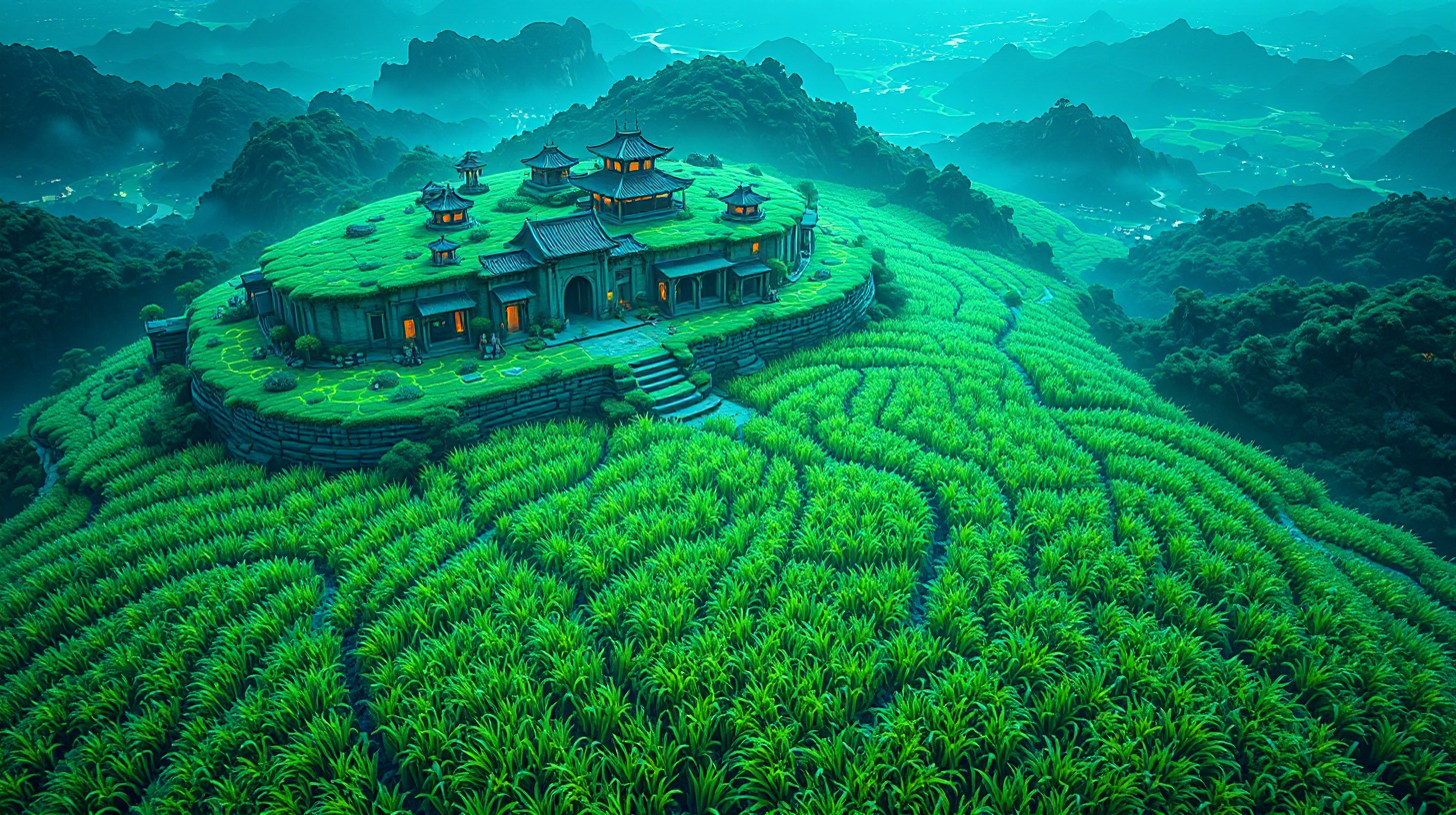 作图提示词:A breathtaking aerial view of Hemudu ruins covered in glowing quantum moss matrix, ancient pottery patterns flowing and reorganizing on the surface. Below, fields of photon information shaped like rice ears undulate like waves, created by schoolchildren wearing neural perception bracelets. Futuristic Chinese landscape with vibrant neon greens and blues, ethereal lighting, cyberpunk atmosphere, ultra-detailed 8K resolution, cinematic composition.