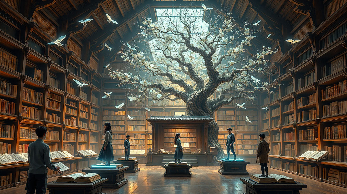 作图提示词:Inside the historic Tianyi Pavilion, ancient books are being restored by flying nanobots that transform the texts into glowing floating program poems. Young scholars stand on mind-resonance platforms, their brainwaves causing the wooden structure of the library to grow new branches of knowledge. The scene is illuminated by the soft glow of the program poems, with warm wooden tones and futuristic blue accents. Mid-range shot capturing the dynamic interaction between the scholars and the library.