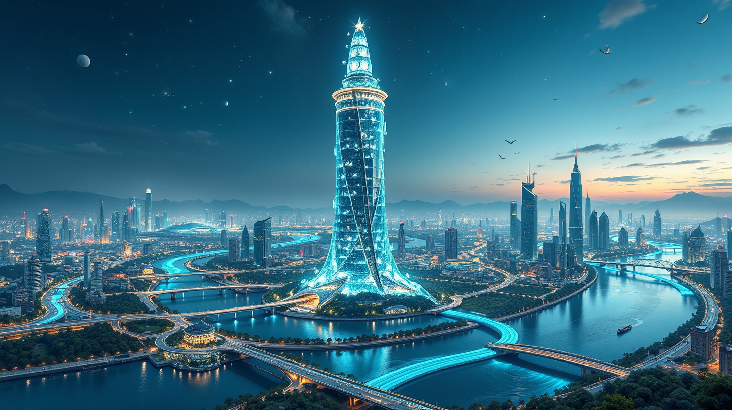 描述:姚江与奉化江交汇处,市民们将思维注入神经花园的催化装置,一座由集体记忆构建的水晶藏书塔自水中升起。塔身折射着千万道记忆之光,塔顶不断生长出新的知识星环,如宇宙星系般璀璨。江水倒映着塔影,将宁波千年的港口故事、书香文脉与未来憧憬凝聚成永恒的光碑,照亮东海之滨的科技航道。