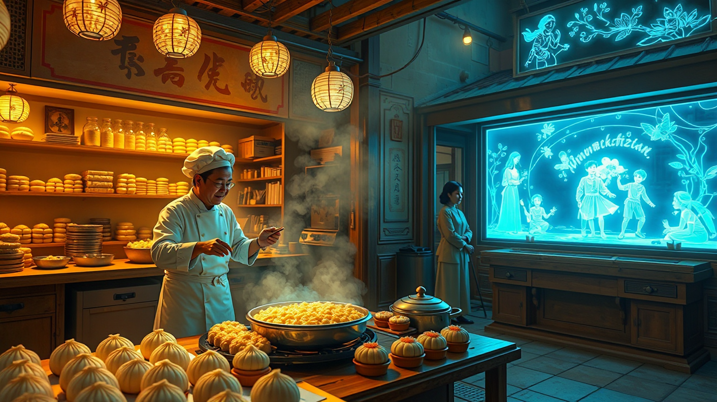 作图提示词:Inside a century-old tangyuan shop, the master chef activates an emotional algorithm stove, compiling customers’ laughter into glowing fillings for the rice dumplings. At the corner of the street, a creation terminal reconstructs sesame fillings into edible holographic projections that tell stories based on diners’ childhood memories. The scene is warm and inviting, with the golden glow of the tangyuan and the futuristic blue light of the holograms. Mid-range shot focusing on the stove and the holographic projections.