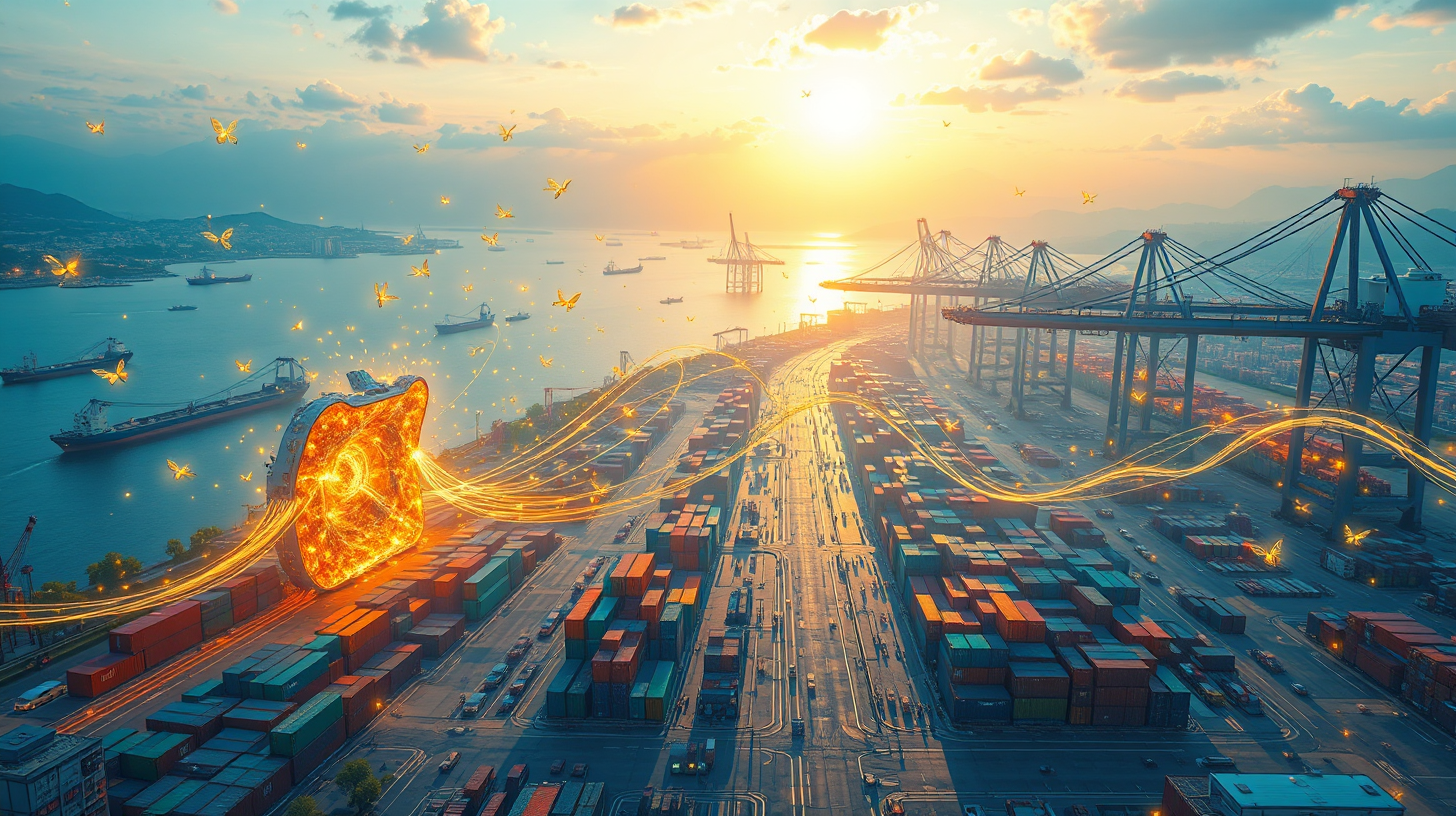 作图提示词:A futuristic Ningbo Port at dawn, where quantum shipping containers unfold into ecological modules, glowing with energy streams. Quantum logistics robots resembling fireflies dart between the modules, creating trails of light. The entire scene is bathed in golden morning light, with the energy streams transforming cargo into radiant energy that flows into the city. Aerial view capturing the vast scale of the port, with vibrant colors of blue, gold, and neon highlights.