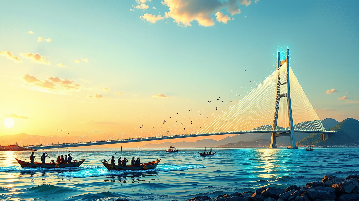描述:杭州湾跨海大桥的斜拉索在潮汐中化作光弦,随着海浪起伏奏响空灵的海洋协奏曲。生物电采集船如银色鱼群穿梭其间,将音符转化为跳动的能源光珠。桥塔顶端,动态语义浮雕如画卷展开,实时勾勒出东海渔场的生态图谱,蓝色光纹与夕阳的金辉在海面上交织,谱写出科技与自然的和谐乐章。