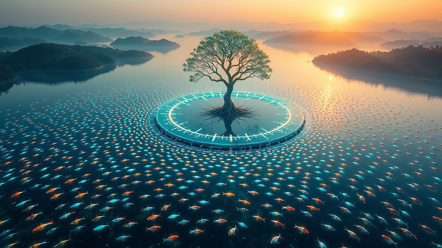 描述:软金色的晨曦漫过太湖水面,巨大的全息年轮投影如透明玉盘悬浮其上,纳米级水分子重组器正释放出蓝莹莹的“水代码”,像星河流淌般完成每日自检。渔夫的智能渔网突然泛起涟漪,一群发光鱼群穿梭其中,它们游动的轨迹竟勾勒出复杂的拓扑数学图案,与水面的全息年轮形成神秘共振,晨光里交织着水波轻拍渔船的微响与智能设备的电子蜂鸣。