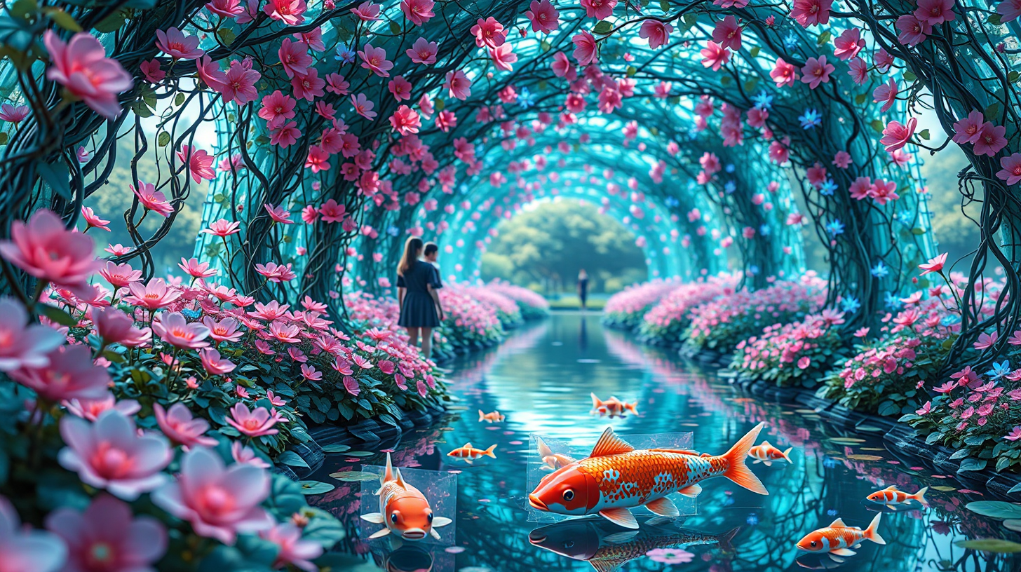 作图提示词:Close-up view of Li Garden’s corridor bridge featuring intelligent vines that bloom programmable flowers in vibrant pinks and blues. Visitors interact with the flowers, which generate personalized Su embroidery patterns in real-time. In the pond below, mechanical koi fish transform water quality data into a miniature holographic ‘Taihu Scenery’. Shot with macro lens at f/4 to capture intricate details, using diffused lighting to highlight the textures and a complementary color scheme of teal and coral.