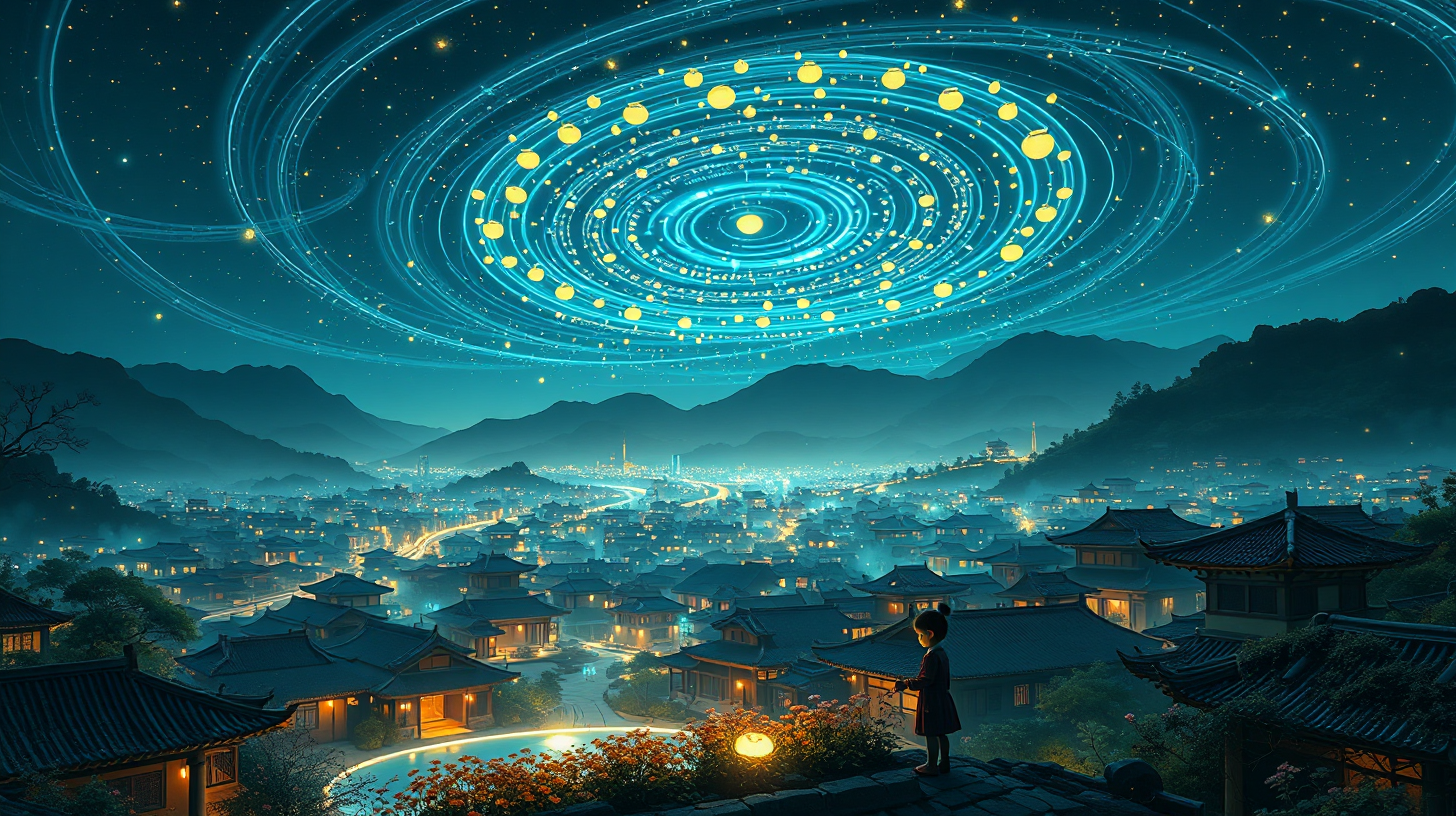 作图提示词:A breathtaking nighttime aerial view of ancient Bozhou, where thousands of glowing smart medicine pots from households converge to form a rotating Taiji medicine mortar pattern in the sky. Ethereal blue and golden light trails create intricate patterns against the dark night. Below, traditional Chinese architecture is softly illuminated by the ambient glow. A child’s silhouette is seen adding wild chrysanthemums to a communal light pool, subtly altering the city’s aroma. The scene blends magical realism with precise lighting effects, showcasing a harmonious fusion of futuristic technology and traditional culture in highly detailed, cinematic composition.