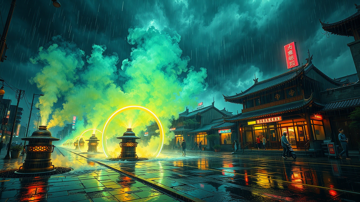 作图提示词:A cyberpunk-inspired futuristic cityscape of Bozhou, Anhui, during a torrential rainstorm. Ancient bronze medicine furnace-shaped purification devices emerge from drainage outlets, releasing vibrant mist infused with herbal essences that form a protective rainbow-like membrane. Dramatic low-angle composition with stark contrast between the dark stormy sky and the neon-lit purifiers. Wet pavement reflects the glowing devices, enhancing the cyberpunk aesthetic. Traditional Chinese architectural elements blend seamlessly with futuristic designs, highlighted by dynamic lighting and highly detailed textures.