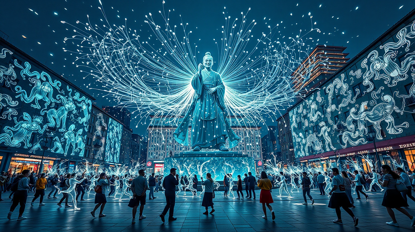 作图提示词:A mesmerizing scene in the city square of Bozhou, where a holographic statue of Hua Tuo comes to life, scattering countless glowing silver needles from its sleeves. The needles draw the Five Animal Exercises in the air, while citizens follow the projections, their movements mirrored by the changing light patterns on the surrounding buildings. The view is from the front, capturing the intricate dance of the needles and the synchronized light show. The scene is dynamic and enchanting, with a perfect blend of ancient wisdom and modern technology. Shot with a medium telephoto lens to isolate subjects, using high-speed sync flash to freeze motion, and vibrant color grading to enhance the light effects.