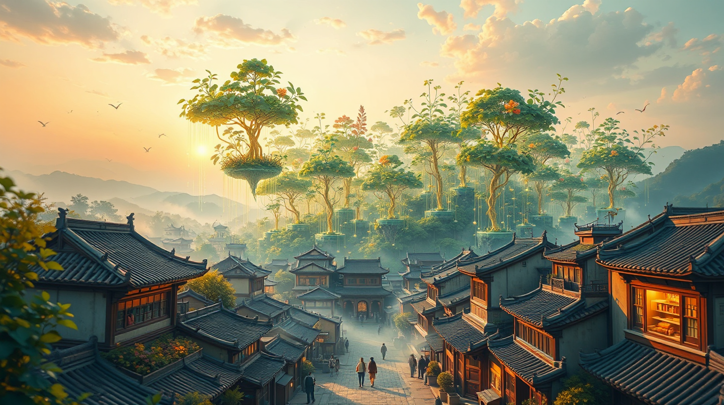 描述:晨曦为亳州古城镀上金边,千万株全息药草如悬浮的翡翠星河,在青瓦白墙之上构筑光幕森林。每株草药根系流淌着液态金般的数据流,如蛛丝般垂落,与老药铺木质柜台里的智能药柜共振,琥珀色药罐在光影中折射出古今交织的涟漪,仿佛时间在此处凝成晶体。