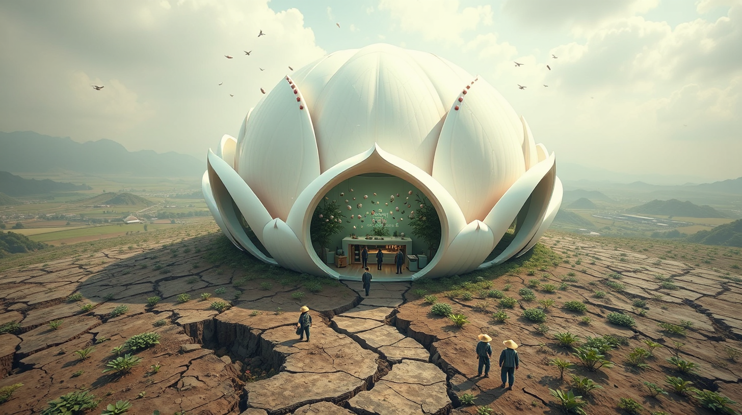 作图提示词:A dramatic scene in the quantum farming area outside Bozhou, where a giant white peony-shaped ecological building rises from the cracked earth. Inside, capsules filled with herbal fragrances float in a children’s traditional Chinese medicine experience center. Farmers in straw hats use neural interfaces to control nano agricultural machines. The view is from above, capturing the moment the earth splits and the building emerges. The scene is surreal and awe-inspiring, with a blend of nature and advanced technology. Shot with a drone for an aerial perspective, using high dynamic range (HDR) to balance shadows and highlights, with a muted color palette to emphasize the organic forms.