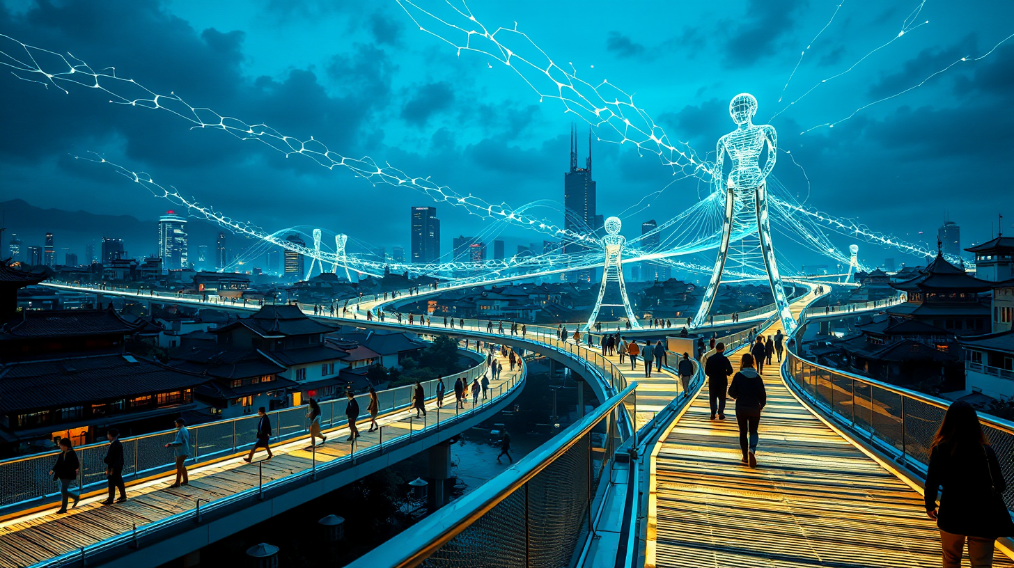 描述:城市上空,青灰色天际被仿人体经络的发光廊桥切割成流动的图谱。幽蓝与暖橙的光带随行人脚步脉动,如气血在血管中奔涌。廊桥下方,雕花飞檐的茶楼与玻璃幕墙的大厦倒影在光带上,形成虚实交错的镜像,仿佛《黄帝内经》的经络图突然有了生命,在摩天楼群间舒展成发光的神经网络。