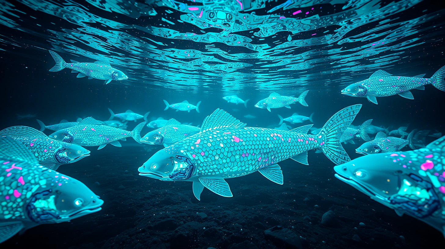 作图提示词:An ethereal underwater scene in the Min River featuring a school of AI-guided cleaning robots transforming microplastic pollutants into luminous art installations. The robots arrange glowing recycled materials into intricate Chinese sturgeon formations that swim via neural network coordination, captured in a low-angle shot with wide dynamic range. The composition uses cool blue-green bioluminescent lighting with caustic water surface effects, rendered in ultra HD sci-fi realism. Vibrant cyan and magenta color accents highlight the artificial marine life against the dark water, with careful attention to subsurface scattering and particulate matter for realism. The scene balances negative space with detailed robotic elements, employing cinematic anamorphic lens distortion for dramatic effect.