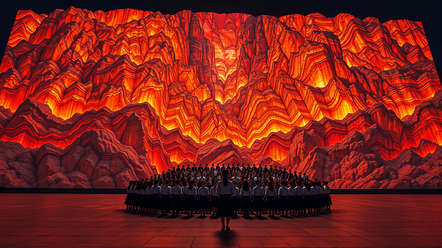 描述:城市中央的巨型仿生丹霞投影墙如大地的切片,橙红色岩层纹路随学生合唱团的客家民谣微微震颤。歌声悠扬处,墙面上的矿物纹理泛起暖光,如岩浆在地表下脉动,光波的频率与音乐的频谱同步共振,将声波转化为可视的地质韵律。孩子们仰起的脸庞被光影染成琥珀色,歌谣的尾音落下时,岩壁突然绽放出万千金色光点,似古老丹霞在科技中重获心跳。