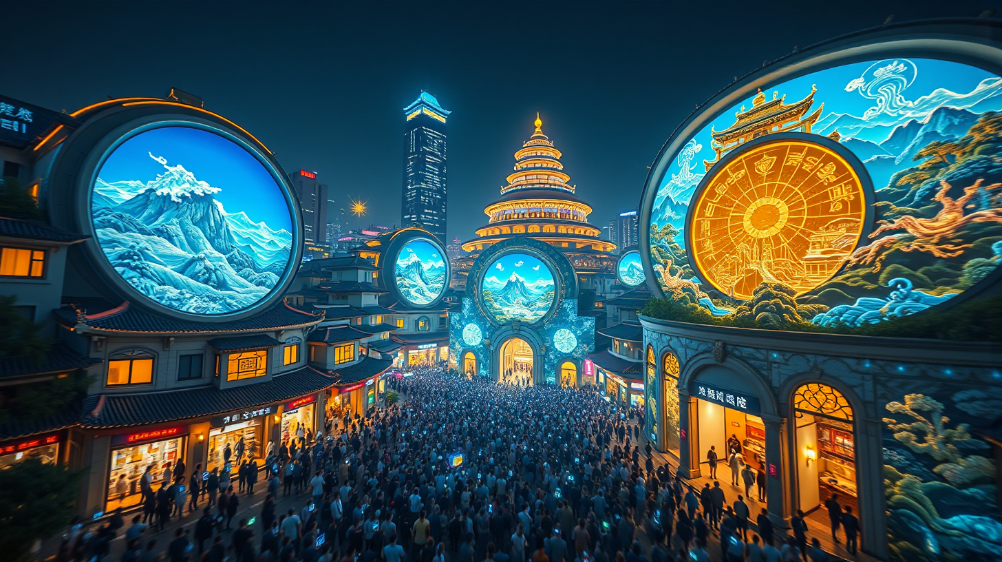 描述:夜幕下的三明如悬浮的星舰,建筑立面的量子点投影正演绎《八闽通志》的历史场景——土楼轮廓与碳纤维结构在光影中重叠,古代商船与未来飞行器在虚拟航道交汇。全城居民佩戴的萤火虫式神经灯突然亮起,590nm波长的暖光在集体脑波控制下流淌,在空中绘出武夷山脉的剪影,山涧云雾由光点组成,随人群的呼吸起伏。无人机群如流星划过,与建筑浮雕的光束共舞,将八闽大地的千年记忆,织成一片漂浮在夜空中的光之织锦。