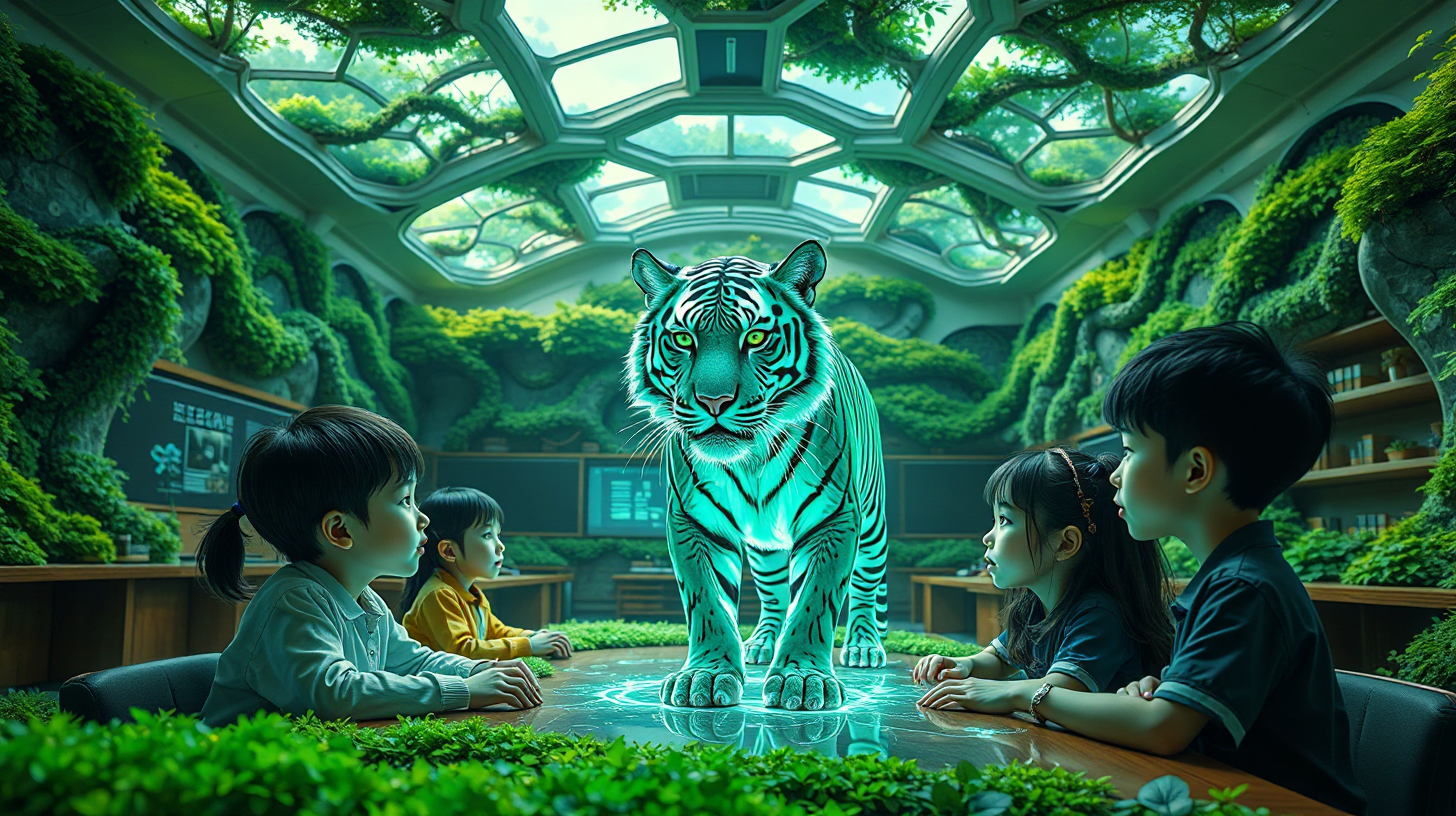 描述:可变形拓扑结构的生态教室里,墙壁如活物般舒展成穹顶,思维投影仪射出的光束在中央凝结成虚拟华南虎。虎身由万千数字粒子组成,每根毛发都在光影中闪烁,孩子们伸出手掌,粒子便如星尘般飘落。森林管理员启动生物雷达,全息地图上瞬间亮起无数绿色光点——那是城市绿肺中藏匿的真实生灵。窗外,阳光透过光伏玻璃,与墙壁上的量子苔藓荧光交织,将课本上的生态知识酿成可触摸的光影寓言。