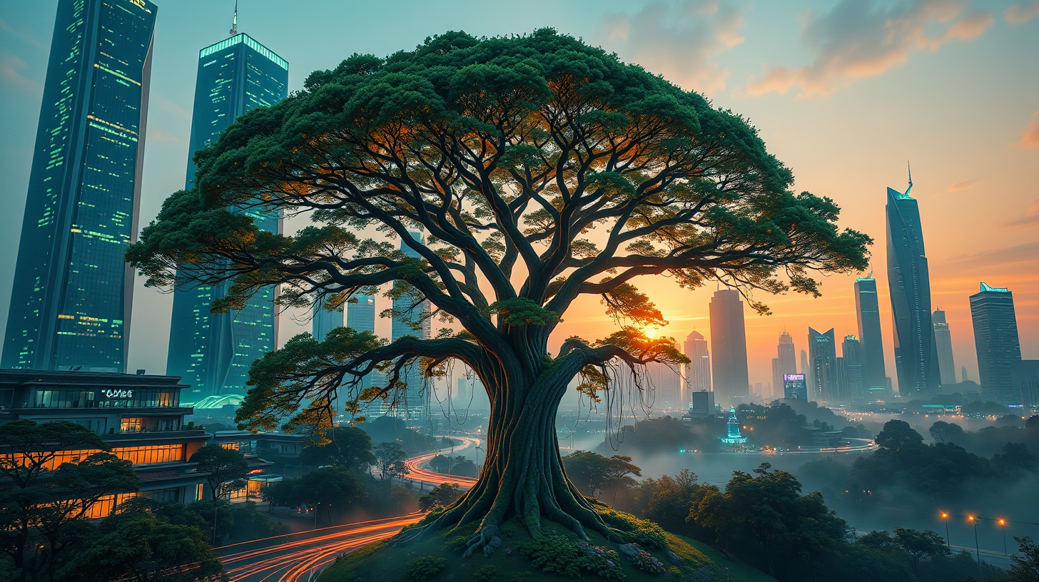 作图提示词:A futuristic cityscape in Sanming, Fujian at dawn, featuring sleek carbon-neutral skyscrapers with living quantum moss facades emitting emerald bioluminescent particles. In the foreground, a majestic century-old banyan tree undergoes ecological restoration by AI-guided nanobot swarms that install smart growth rings with real-time environmental data tracking. Captured from an aerial drone perspective at golden hour, the composition shows dynamic light trails converging on the tree, rendered in ultra HD 12K resolution with sci-fi realism. The scene uses vibrant cyberpunk-inspired color grading with teal-orange contrast, dramatic volumetric lighting through atmospheric haze, and precise depth of field to emphasize the tree as the focal point.
