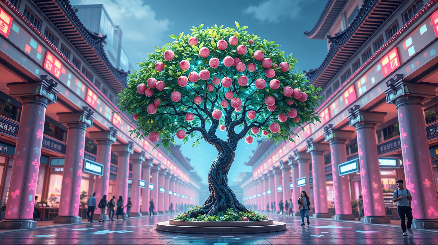 作图提示词:Xiguan arcades with anti-gravity modules growing from traditional column bases, embedded with holographic tea market projections. Young makers transform ancient water clock mechanisms into data rain generators, nourishing the central luminous lychee tree whose leaves refract prismatic light. The scene highlights gravity-defying architecture and chromatic light plays on cyber-botanical hybrids. Shot with a medium focal length to balance the architectural details and the holographic projections, using a shallow depth of field to blur the background and highlight the luminous tree. The lighting is a mix of natural daylight and the vibrant colors of the holograms, creating a surreal yet harmonious atmosphere.