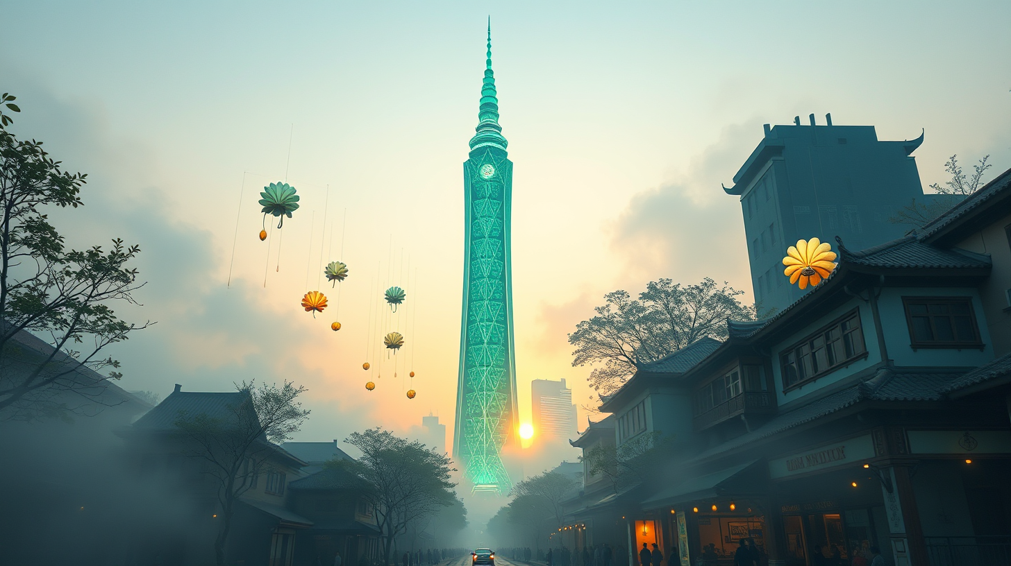 作图提示词:A futuristic Guangzhou Tower at dawn, its quantum light patterns unfolding like kapok petals, nano-coating gradually shifting to Lingnan celadon hue in the sunrise. Suspended dim sum robots deliver shrimp dumplings via light trails above the old town district, while dynamic Cantonese opera mask projections interact with traditional arcade buildings. Morning mist diffuses the light trails into living light paintings, creating a cyberpunk Lingnan aesthetic with strong visual impact. Shot with a wide-angle lens to capture the grandeur of the tower and the intricate light patterns, using a shallow depth of field to emphasize the foreground details. The lighting is soft and diffused, enhancing the ethereal quality of the scene, with a color palette dominated by celadon greens and warm sunrise hues.
